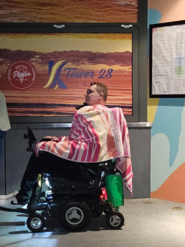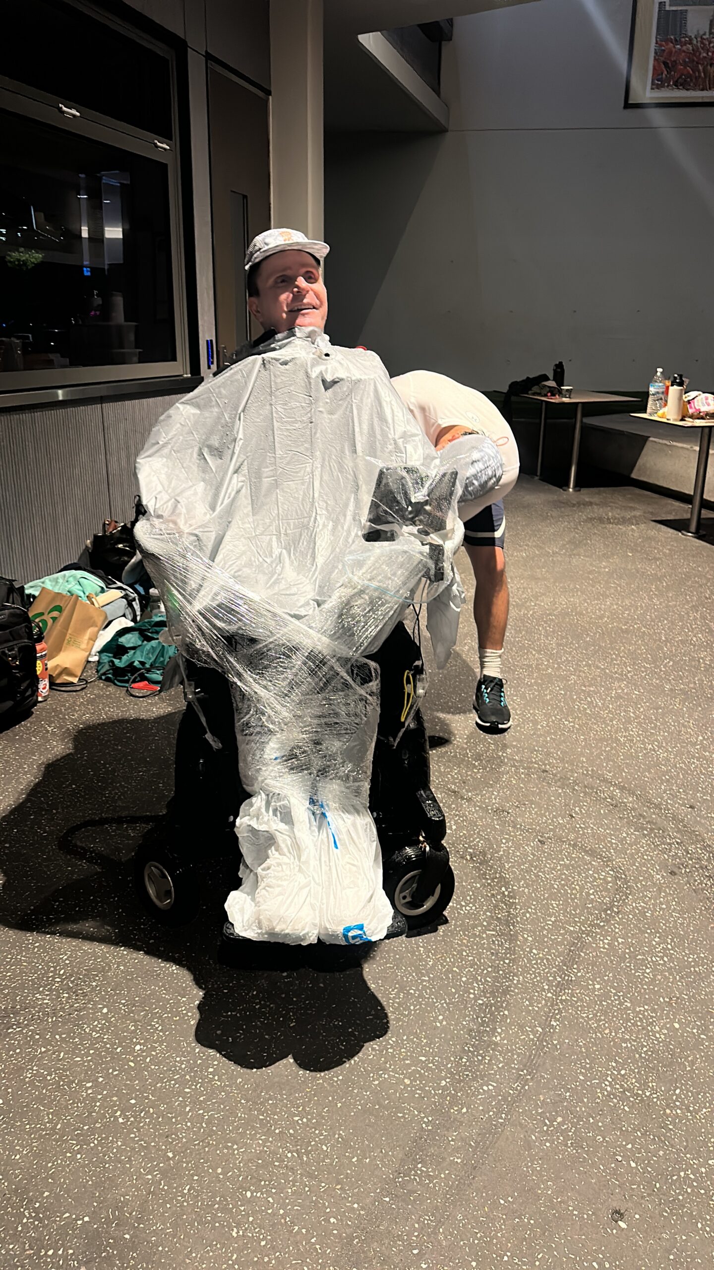 Perry navigated his 300kg power wheelchair using a chin control, as a C2 ventilated quadriplegic, braving wind, cold and relentless rain. As protection from the elements, Perry (including his wheelchair, ventilator and battery) was wrapped top to bottom in ponchos, Perry was even wrapped in glad wrap to help keep warm! He pushed through conditions that would stop most in their tracks.
